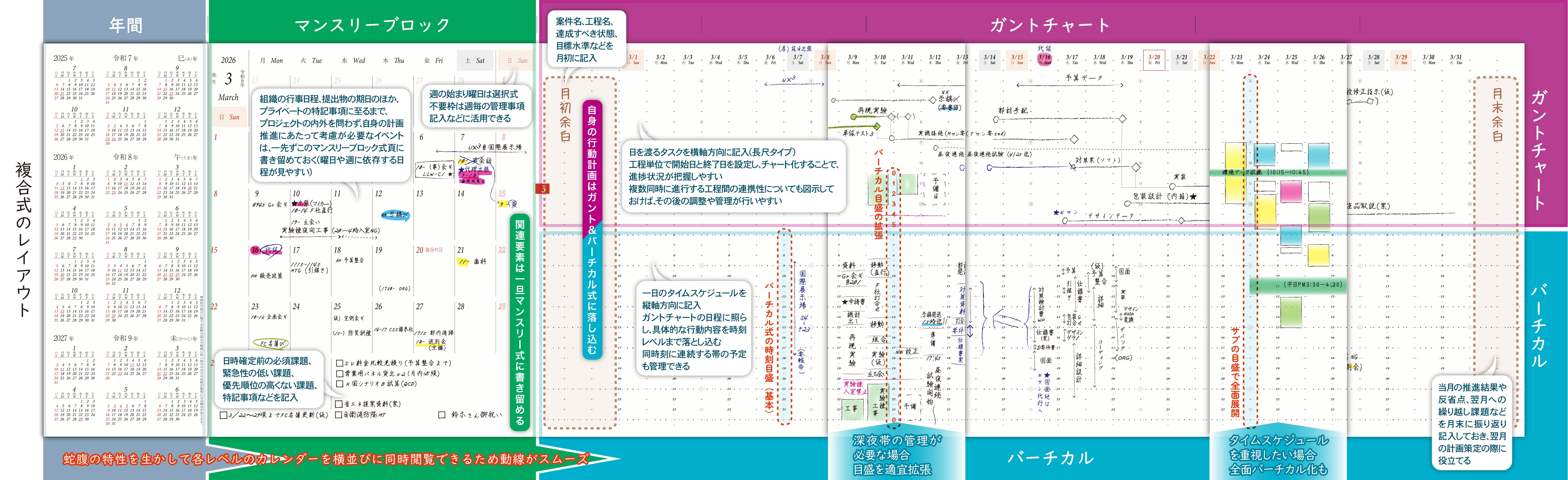 マンスリー式カレンダーとガントチャート&バーチカル式カレンダー1ヶ月分の見開きを横並びにレイアウトした複合方式を採用。月末には進捗状況などを振り返り記入するためのスペースを確保。