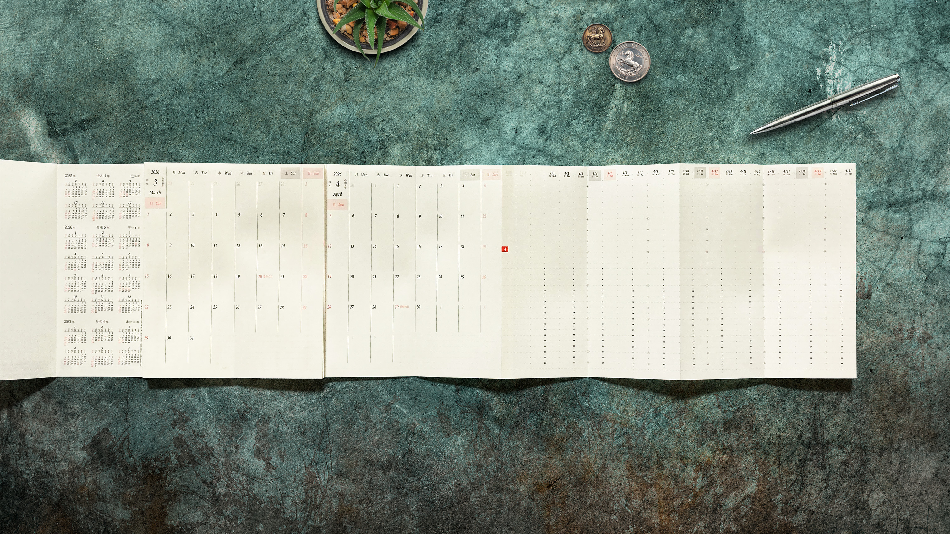 蛇腹折り用紙の伸縮方向を時間軸にレイアウトしているため、時期の遠近・期間の長短ボリュームを俯瞰で直感的に把握できます。